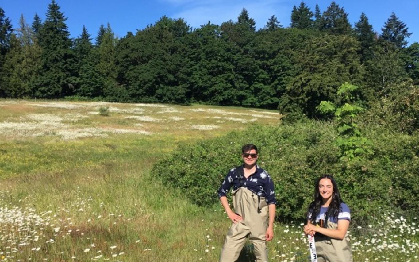 On Tuesday, June 11th, Alanna, Colby, and I visited the beautiful Westwood Farm and Cathers Lake to continue water monitoring and plant identification. Westwood Farm is 48 gorgeous acres of meadow bisected by the Millstone River and Sabiston Creek. We plan to do minnow trapping and water monitoring in the Millstone, but we have had difficulties accessing the water due to a 2-3 meters barrier of Himalayan blackberry preventing our entry. In our previous visit we were able to locate an access point, so today we went exploring. Equipped with chest waiters, GPS, sonde, and data sheets, we trekked through the blackberry thorns into the river. The river was lovely and despite a few mis-steps into unseen holes that almost dunked us, the monitoring went smoothly. Unfortunately, we were unable to walk the full length of the river due to its depth. We took pictures of the plants in both the riparian area and the meadow for identification at the office and headed to our next destination: Cathers Lake. As we were leaving, Alanna, Colby, and I were checking to make sure we had grabbed all of the equipment when a large buck jumped out of the barn and ran to the field. It was so close that we could see the velvet on its antler. It was amazing way to end out visit at Westwood Farm.