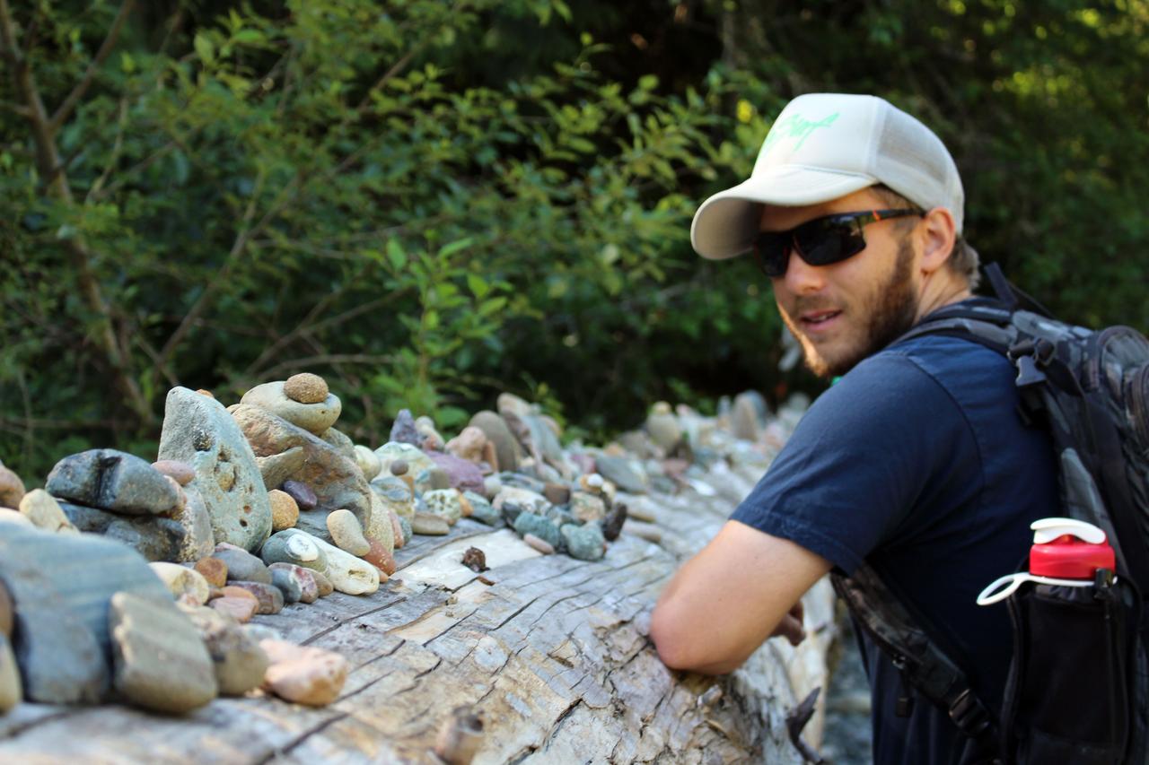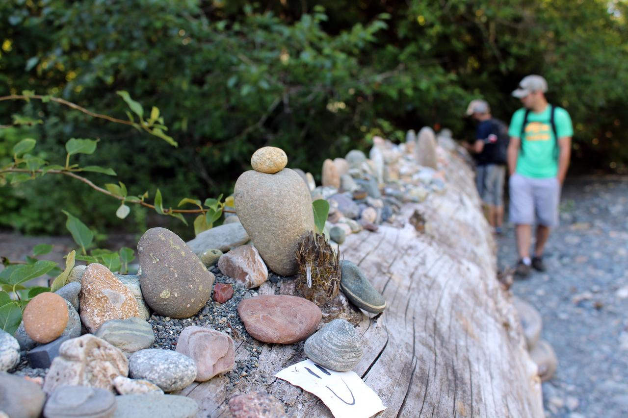 On Tuesday, Mike, Graham, and I explored the Top Bridge Regional Trail. We started a the Grieg Road access and made our way down to the Englishman River to check out the area where VIU geography students usually complete the hydrology component of their Geog467 field course. Here we met a lady and her two dogs who were thoroughly enjoying the water. As we were leaving, she pointed out an impromptu art installation that we should check out just around the corner. This was a log on top of which someone (or multiple someones) had purposefully stacked rocks. There were a couple of other decorations, including a crayfish shell, a few signs or notes, and some brightly painted rocks. It was a pretty cool example of people interacting with nature.